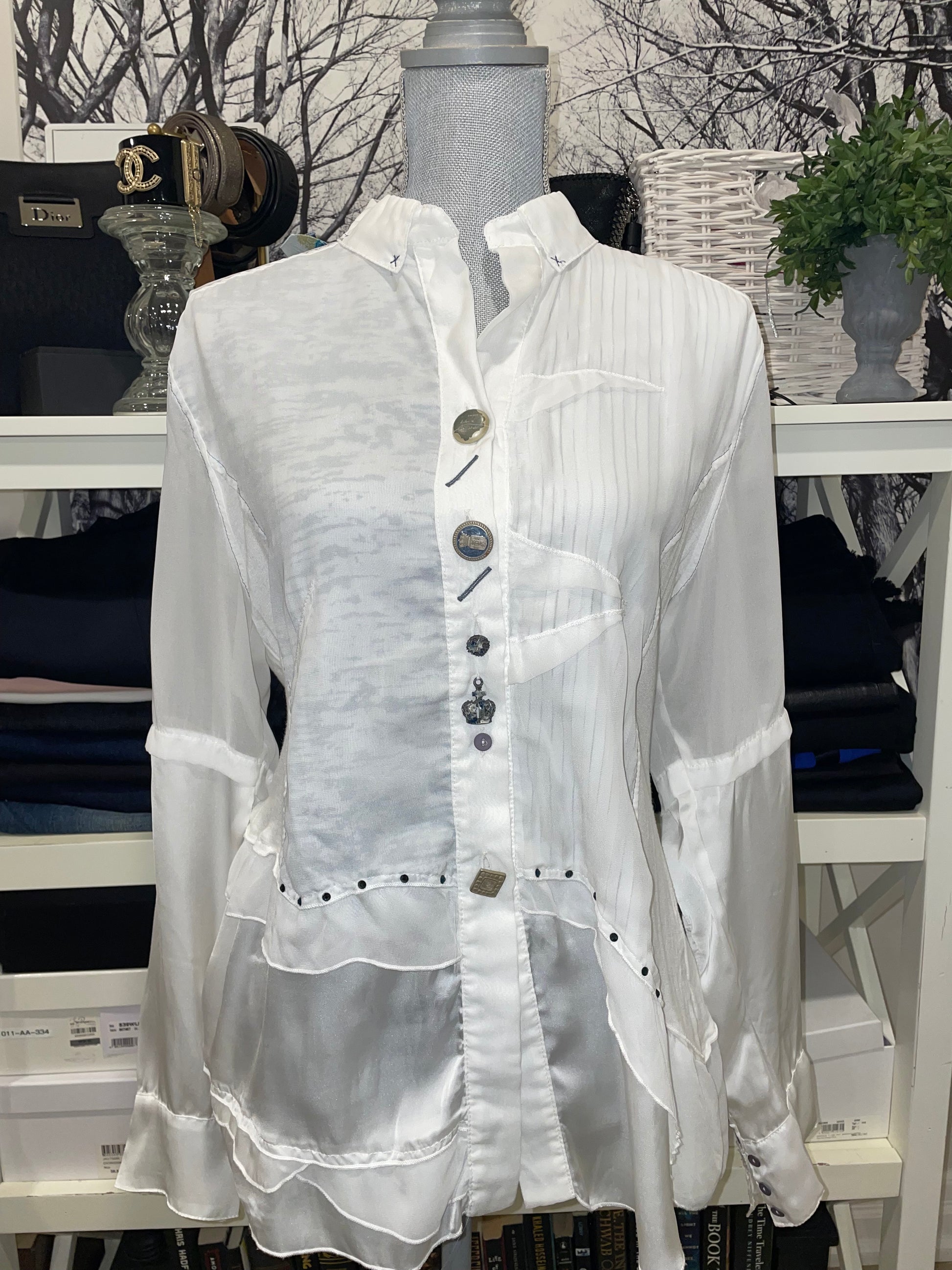 Elevate your wardrobe with the Elisa Cavatelli Blouse. Crafted in bright white with mismatched button details, this blouse is in beautiful condition. Perfect for any occasion, add a touch of sophistication to any outfit.