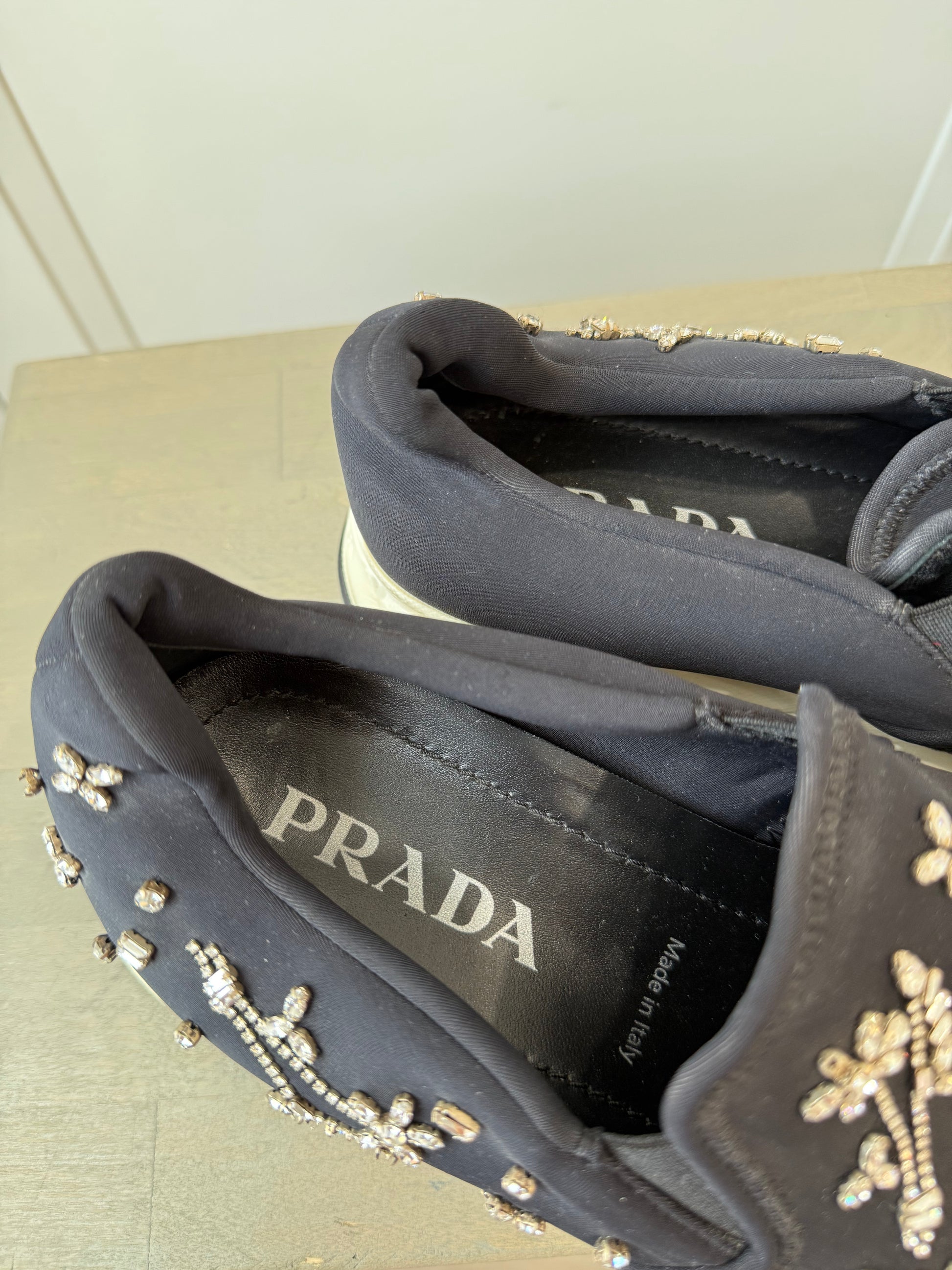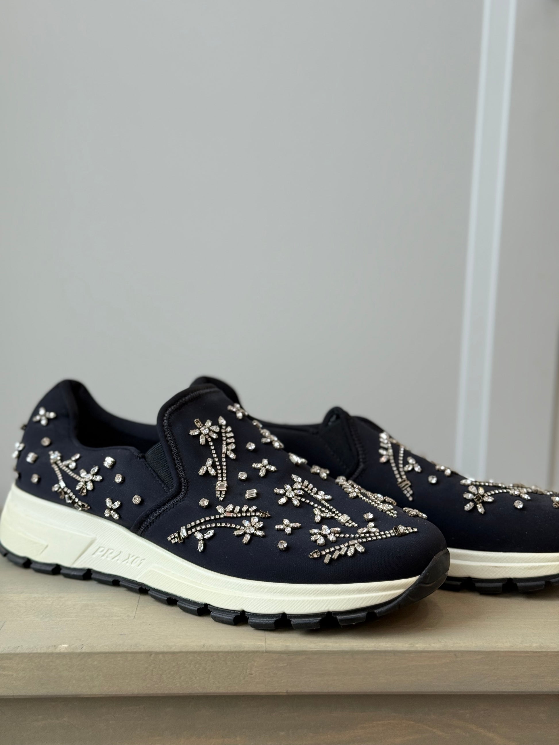 Prada Downtown Black Neoprene Trainers w/ Swarovski Floral Embroidery – EU 39