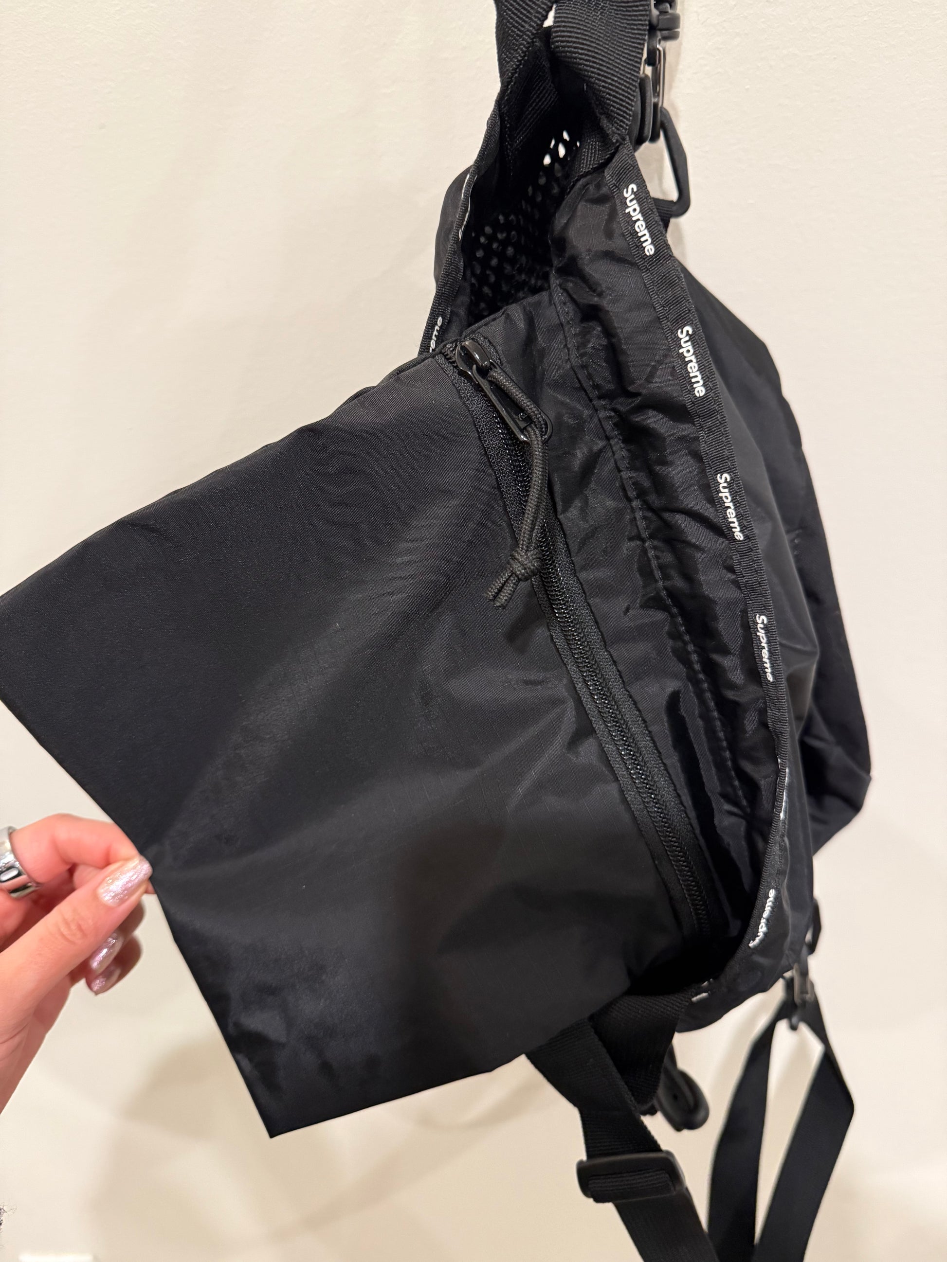 Black mesh sling bag featuring adjustable strap and subtle Supreme branding throughout. Pre-owned in good condition with light wear; a functional, street-ready accessory that’s perfect for everyday use.